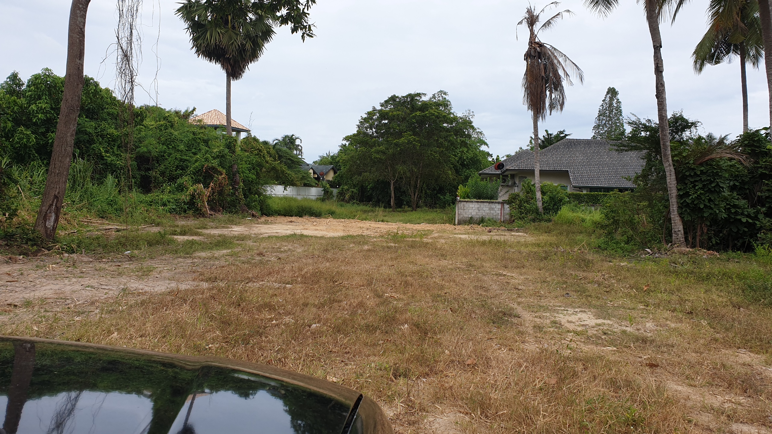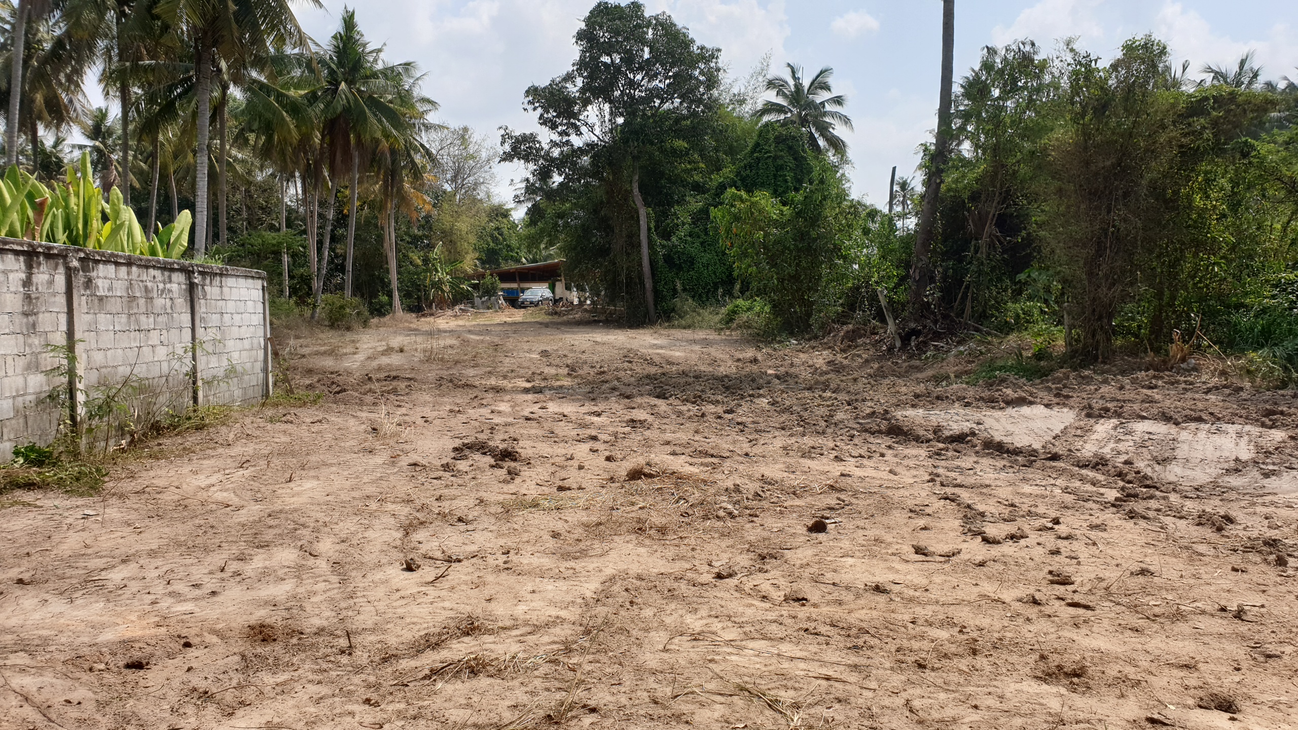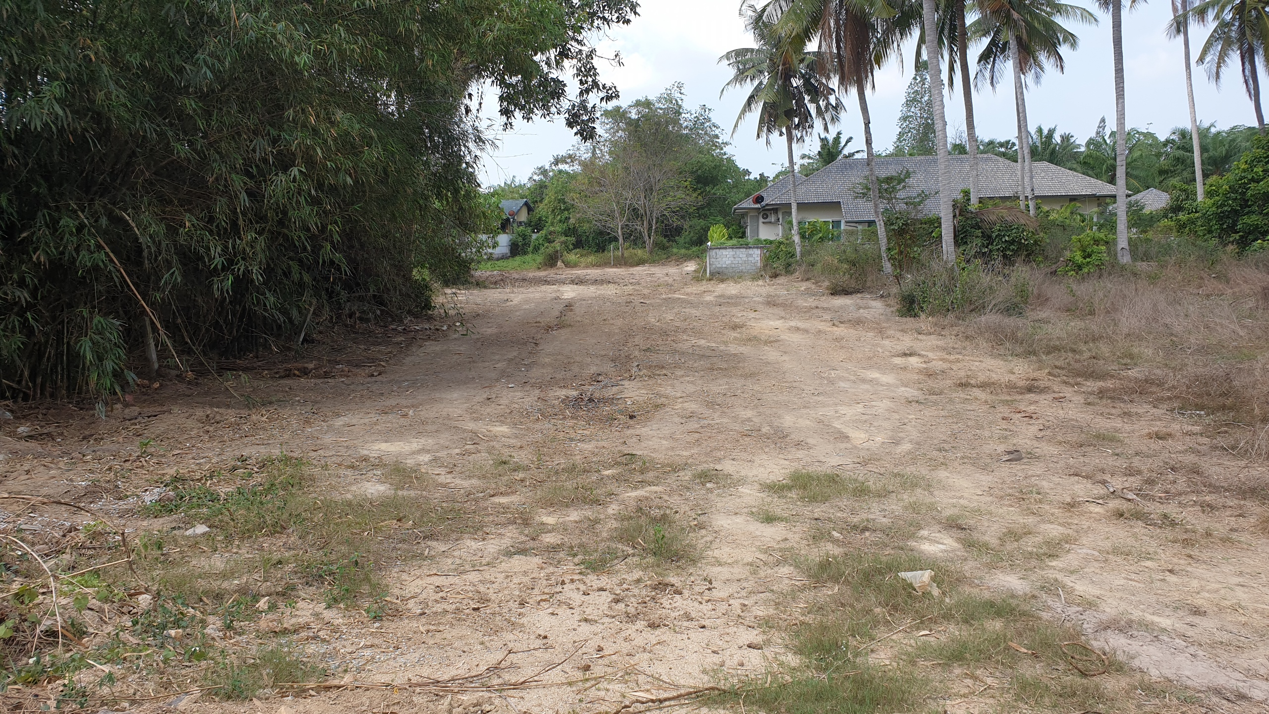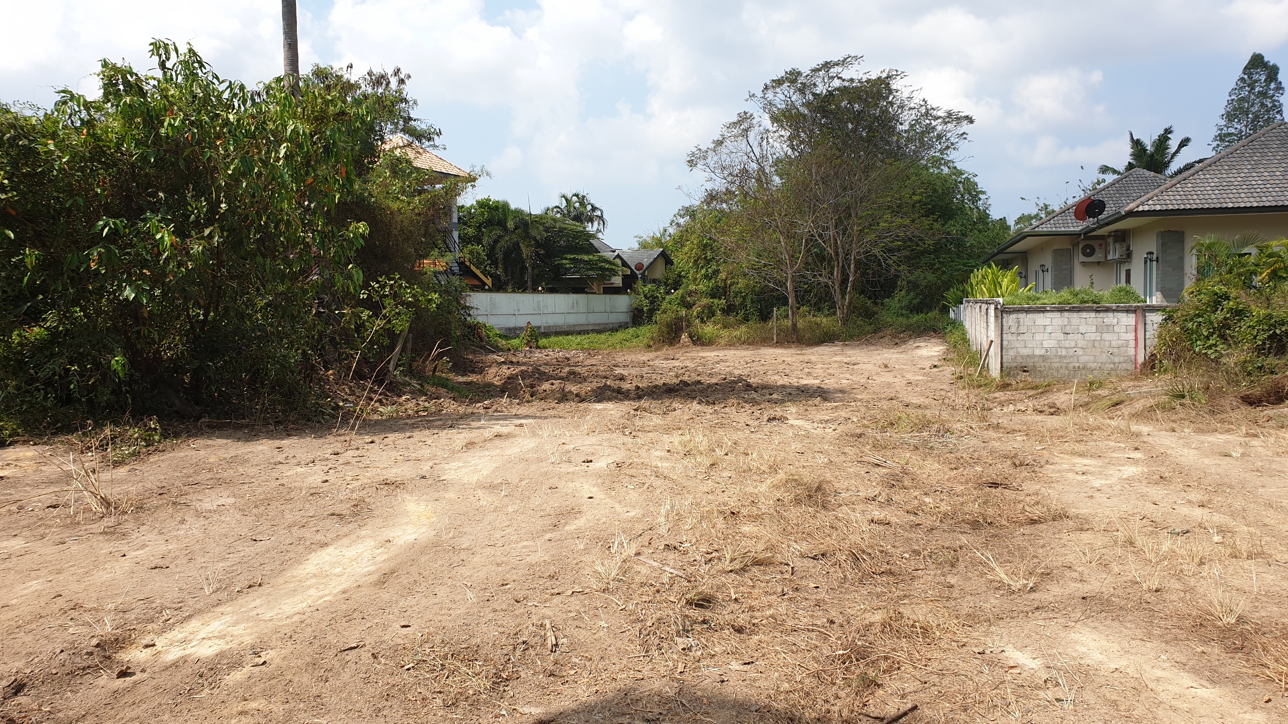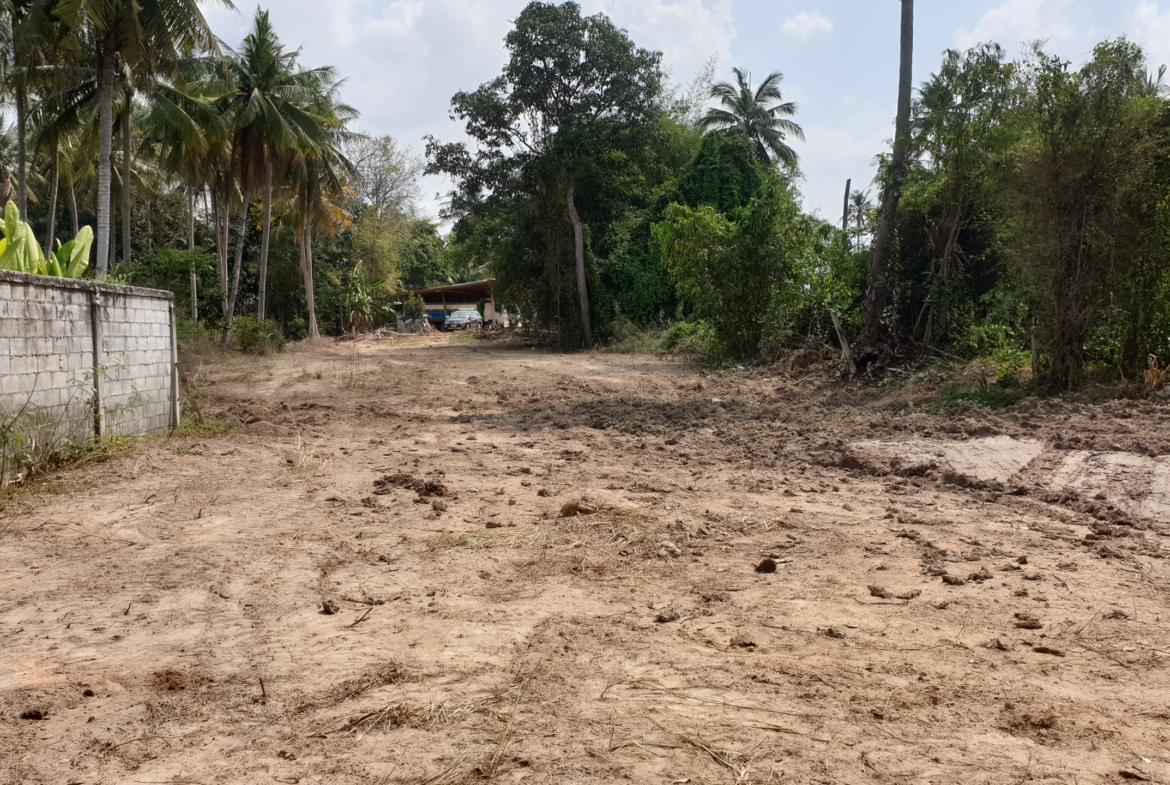 Low lying backland at end of small unmade up government soi. Up market farang neighbours and storage yard for earth moving machines adjoining. Long rectangular shape