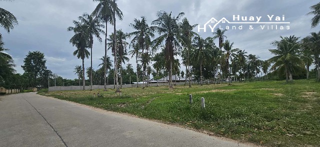 Road frontage land. Walled to one side. Upmarket quiet area just off Huay Yai Road. Very prestigious up market area of large farang villas. Wide 10m road (to be given to government) to one side. Beautiful flat level land partly walled to one side with coconut trees on tarmac government soi. Many very up market farang villas adjacent and opposite. 3 phase electric and fibre optic available in soi